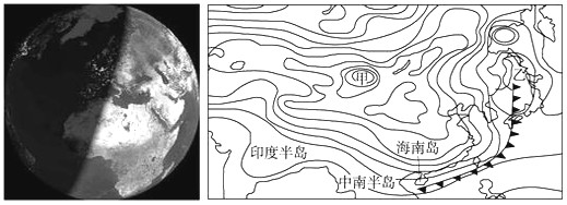 5、综合题 下面左图展现了某一时刻地球晨昏线的分布,右图为某时刻亚洲部分地区气压分布图,据图回答下列问题。