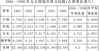 1、综合题 阅读资料,回答有关问题。 资料一:胡鞍钢和门洪华(2002)将国家战略资源分为经济资源、人力资本、自然资源、技术资源、资本资源、政府资源、军事资源、国际资源等八个方面,利用23项指标,衡量了中、美、日、印、俄五大国的综合国力(见下表)。根据这一项研究,人力资本是中国各类战略资源中最具潜力的资源。