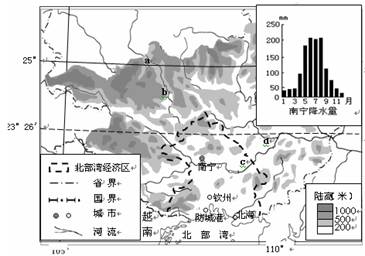 (1)说明南宁的降水特征及原因。(10分) (2)分析广西西部冬春季节易发生旱灾的自然原因。(6分) (3)在a—b与c—d河段中任选一个,指出人类对其利用的主要方式并说明理由。(6分) 广西是我国重要的电力供应基地。 (4)说明广西电力开发与输出对当地地理环境的影响。(8分) 国家提出把广西北部湾经济区建设成为重要国际区域经济合作区。 (5)简述北部湾经济区成为重要国际区域经济合作区的有利条件。(6分)