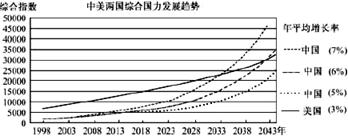 (1)1998年,五个国家比较,综合国力居第一位的是__________,居第二位的是__________。1980—1998年,中国综合国力的年变化量约相当于美国的______倍,中、美两国综合国力的差距在逐渐__________。 (2)读资料二图,按7%、6%的年平均增长率,中国将分别于__________年和__________年达到美国的综合国力水平。 (3)中、美两国基本实体方面的差异,表现在 A.中国的领土面积大大超过美国 B.中国的人口数量大大超过美国 C.中国国民受教育程度低于美国 D.中国是资源大国,美国是资源小国