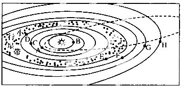 (2)图中字母表示的行星中,质量和体积都很大的是E、F。它们都属于巨行星。