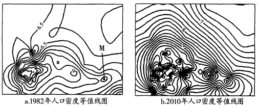 4、单选题 下图为某城市人口密度变化图,图中所标注的等值线值为人口密度自然对数值。据此完成下列问题。