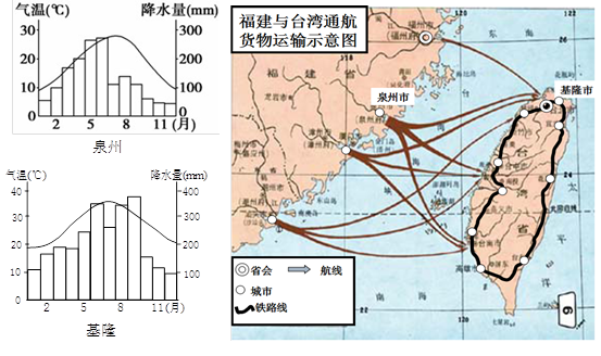 (1)泉州和基隆同为海港城市,都是亚热带季风气候,气候有很多相似之处,如夏季都高温多雨,冬季温和湿润,降水季节变化大,雨季较长等,而基隆冬季盛行东北风,从海上携带大量水汽,加之山地抬升,易形成地形雨,故基隆冬季多雨。
