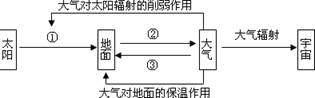 本题解析:根据大气受热过程可知,①是介于太阳与地面之间,是太阳辐射到达地面;②是地面向大气辐射能量;③是大气对地面的逆辐射。