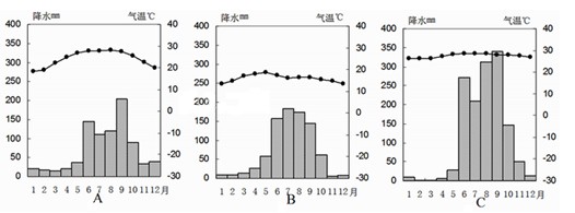 (2)A、B、C三幅气候资料图中,属于丙地的是_______,说明理由________________________________________________________________。