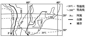【小题2】读图可知同纬度地区海洋温度低于陆地温度,由此推断该季节为夏季,P地为地中海气候区,冬季温和多雨,夏季炎热干燥,故A正确。