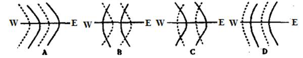 小题2:下图中能正确反映枯水期该河段河水与两岸地下水关系的是(图中实线为等高线,虚线为潜水面等高线,直线实线为河流)?(?)