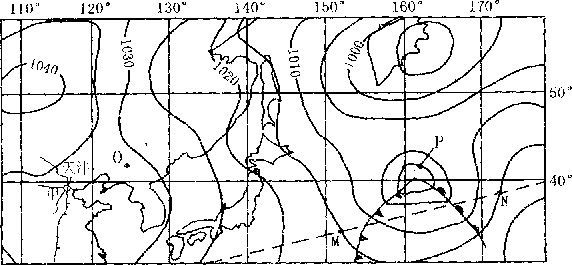 1、综合题 读世界某地域某日海平面等压线(单位:Hpa)分布图(虚线表示航海线),回答下列问题。(16分)