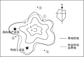 小题1:图中等地价线从多个方向向外弯曲突出,反映弯曲处地价比两侧高,应该处于放射道路与城市环路交汇处,该城市道路网为环行放射状,等值线弯曲与交通通达度有关,从a→d分布有商业区、住宅区和工业区,市区边界应在由于城市存在导致的热力环流边界上。