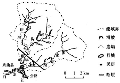 材料一:2010年8月7日23—24时的1小时内,甘肃舟曲的降雨量达77.3mm,位于舟曲的三眼峪沟流域(最高点海拔3828m,最低点1340m)和罗家峪沟流域(最高点海拔3794m,最低点入河口处为1330m),暴雨形成强大洪水依次冲毁两条沟内的天然堆石坝和人工拦挡坝,形成规模巨大的泥石流,冲毁房屋5500余间。