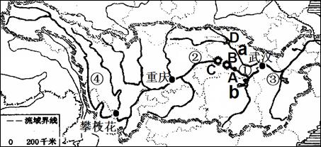 本题解析:(1)直接根据图示的长江支流分布判断,a为汉江,b位于湖南省,为洞庭湖。(2)图示为长江流域,为我国长江沿岸工业地带分布区。图示A城市位于水电站附近,故电力工业发达,而攀枝花、重庆和武汉是我国著名的钢铁工业城市。(3)由于荆江河段河道弯曲,故流速缓慢;图示C为长江三峡,而B为葛洲坝水利工程。D为丹江口水库。河流流域内的生态环境问题,主要通过水利工程和防护林建设;由于长江上游地区水土流失严重,故防护林的主要功能为保持水土。(4)河流流域的洪涝灾害主要是由于河流特征(流域面积和支流分布等)、地形条件、降水条件和人为原因等,而植被破坏主要在河流上游,长江的九曲回肠主要是中游,故⑥⑧错误。(5)水利工程建设利于改善河流上游的航运条件,即②段的航运。(6)华东和华中地区主要为能源的输入地,其意义可从经济效益、环境效益综合分析。