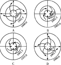 反气旋中央气压高,北半球顺时针向四周辐散。所以本题选择A选项。