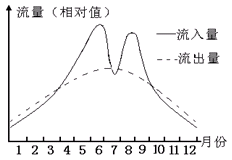 【小题1】通过读图分析:只有流入量大于流出量时,水位会持续上涨,本图水库从4月份流入量大于流出量,水位开始上涨,至6月中旬时,水库流出量大于流入量,表明水位达到顶峰后开始下降,因此B正确。
