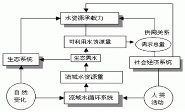 2、单选题 下图为区域(流域)量化水资源承载力的系统关系示意图,读图回答1~2题。
