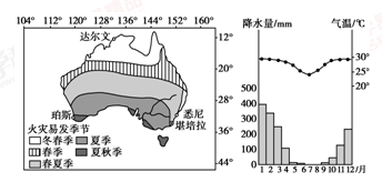4、单选题 左图表示澳大利亚不同地区最容易发生火灾的季节,右图是达尔文市的气候统计图。
