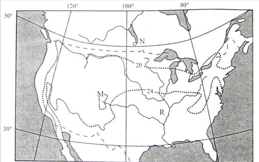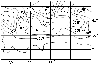 【小题1】等压距为5,所以1005<乙<1010,甲在海洋上,此时为冬季,所以,甲外围等压线数值为1020,1015<甲<1020,二者结合,5<R<15,所以R的最大值范围为14<R<15。
