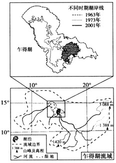 [? ] A、流域面积减小 B、湖泊水位总体下降 C、流域主体位于热带荒漠 D、1963年时湖底东南高,西北低