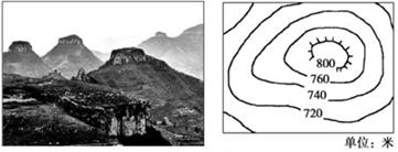 5、单选题 “岱崮地貌”(左侧为景观图,右侧为等高线示意图)是山东沂蒙山区特有的一种地貌景观,过去在地貌学上称之为“方山”,该山体岩石中普遍含有三叶虫化石。据此回答问题。