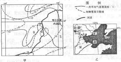 (1)简要回答:甲图中P处等温线向北弯曲和Q处年降雪日数多于周边地区的主要原因。