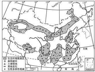 小题2:结合图例③④⑤区域主要的生态环境问题是土壤侵蚀,由于分布于我国东部季风区,故判断主要为水蚀,故其成因主要从自然原因:气候、地形等和人为原因:植被破坏和不合理的工程建设等方面分析。