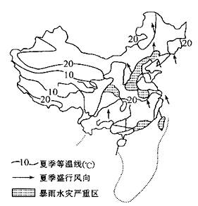 4、单选题 下图为我国某年夏季等温线和盛行风向图(图中打点部分为我国暴雨洪水严重的地区)。回答下列各题。