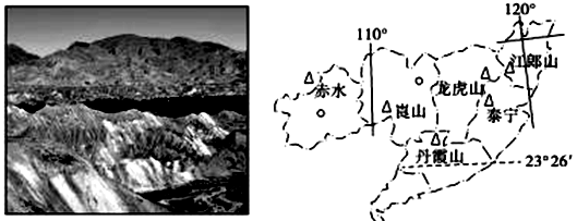材料二 下图为丹霞地貌和“中国丹霞”六个风景区所在区域图。