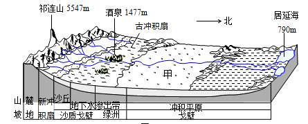 ![]() A.甲—Ⅲ B.乙—Ⅳ C.丙—Ⅰ D.丁—Ⅱ 4、单选题 读祁连山---居延海自然景观剖面图(下图),完成下列各题。 |