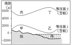 【小题1】根据气压的形成原理可知,近地面气压高于高空气压,即图中甲、乙两地气压高于丙、丁两地气压;根据等压面的弯曲方向可知,近地面的甲点气压高于乙点,高空中丁点气压高于丙点,因此四地气压由高到低依次是甲、乙、丁、丙。