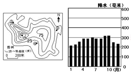 3、单选题 读太平洋中部某小岛等高线和降水季节分配柱状图,回答1—2题。
