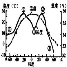 1.根据海水盐度副热带海区最高、依次向南北两侧递减,以及海水温度由低纬度向高纬度递减的规律(下图),可判断图中①②③分别是温度、盐度和密度线。进而可知,赤道地区温度高、盐度较低、密度小。