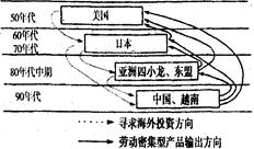 ①地表平坦? ②位于我国大陆向东延伸的大陆架上 ③距我国大陆约350KM ④其东南侧的P点位于环太平洋地震带上 ⑤渔业资源丰富主要是因为盛行上升流 A.②③④ B.②④⑤ C.①②④ D.①④⑤ 4、单选题 读20世纪50-90年代,亚洲出口型劳动密集型工业分布变化图,完成问题。 |