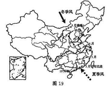4、综合题 第16届亚洲运动会将于2010年11月12日至27日在广州举行。图19是我国东部地区一般年份季风进退情况示意图,读图回答下列问题。(12分)