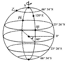 4、综合题 读图,当太阳直射甲点时,回答下列问题。