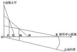 A.城市化水平比较高,城市人口增长趋缓 B.上世纪60年代以前,城市核心区面积增长速度明显高于城乡过渡带 C.城市规模扩大,出现郊区城市化 D.城市核心区规模减小,出现逆城市化 3、单选题 读“城市土地利用与付租能力关系图”,完成下列小题。 |