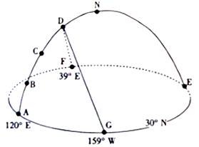 (4)一架飞机从G点飞到F点,最合理的飞行路线是(填写字母)___,其方向是___(4分)