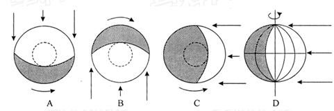 4、单选题 下图中能正确表示北半球夏至日光照情况的是(图中虚线圈为极圈,直线箭头表示光线,弧线箭头表示地球自转方向)( )
