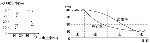 4、单选题 图1为甲、乙、丙、丁四国人口增长状况图,图2为不同阶段人口发展模式图。读图回答下列小题。