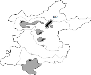 读“华北某城市平原区地面沉降分布(数值单位:cm)”图。回答问题。