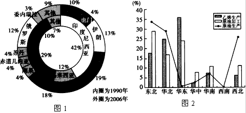 1、综合题 ? 图1为1990年和2006年我国原油进口来源地结构图,图2为2006年各地区原油生产原油加工和乙烯生产产量占全国的比重。读图回答问题。