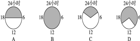 5、填空题 (10分)下面为“12月22日A、B、C、D四城市昼夜长短变化示意图”,据图完成下列问题。(阴影表示黑夜)