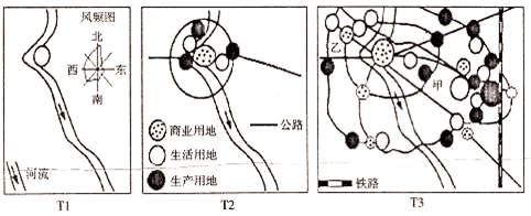 (4)阶段T3中住宅区出现了分化,分析判断图中甲为______住宅区,乙为______住宅区;该住宅区分布在乙处的原因为______。