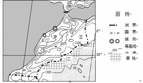 太阳能是清洁、高效的新能源。德国早在四年前就启动了开发非洲北部沙漠地区太阳能发电项目(DESERTEC),计划逐步在北非沙漠地区建立多座太阳能发电站,满足欧洲约15%的用电需求,其余供应电站所在国。经考察甲国将成为这一项目的最佳投资地。下图是甲国等高线地形简图,下表是K港口气候资料表。
