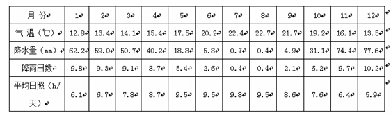 (1)气候特征主要从气温和降水两个指标来描述,读表分析可知:K港口属于地中海气候,其特征为:夏季温和干燥,冬季温和多雨,气温年较差小。影响气候特征的成因主要地理位置、大气环流、洋流、地形等因素,结合K港口展开叙述即可。