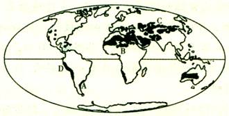 (1)(10分)图中黑色阴影区所反映的地理事物属于两种气候类型,其中B的名称叫?,C的名称叫?。造成B、C气候类型的成因不同,B的成因是?,C的成因是?,两种气候类型区的地貌有共同特征,都是以?地貌为主。
