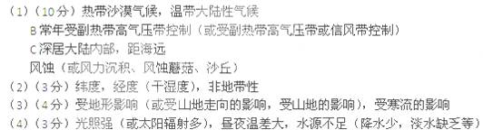(1)(10分)图中黑色阴影区所反映的地理事物属于两种气候类型,其中B的名称叫?,C的名称叫?。造成B、C气候类型的成因不同,B的成因是?,C的成因是?,两种气候类型区的地貌有共同特征,都是以?地貌为主。