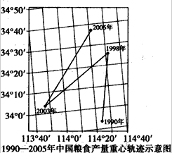 右上图是1990~~2005年中国粮食产量重心轨迹示意图。
