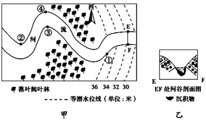 【小题1】从乙图可以看出,EF处为背斜顶部被侵蚀而形成的河流,从中心向两翼,岩层由老到新;该河位于大陆东岸,河流向东注入海洋,地势西高东低;②③位于凸岸,堆积作用为主,④位于凹岸,侵蚀作用强;该地植被类型为落叶阔叶林,位于大陆东岸,为温带季风气候。