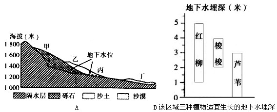 1、单选题 下图为我国某区域地形剖面图和该区域三种典型植物生长与地下水埋深图。读图完成1~2题。