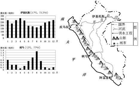 (1)比较说明伊基托斯与利马年降水总量的差异及原因。(7分) (2)简述地形对秘鲁东水西调工程的影响及可采取的措施。(5分)
