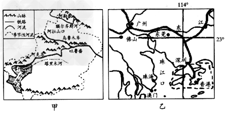 2、单选题 2010年5月,喀什经济特区成立;2010年8月26日,深圳经济特区成立三十周年。读甲、乙两地区示意图,回答1—2题。
